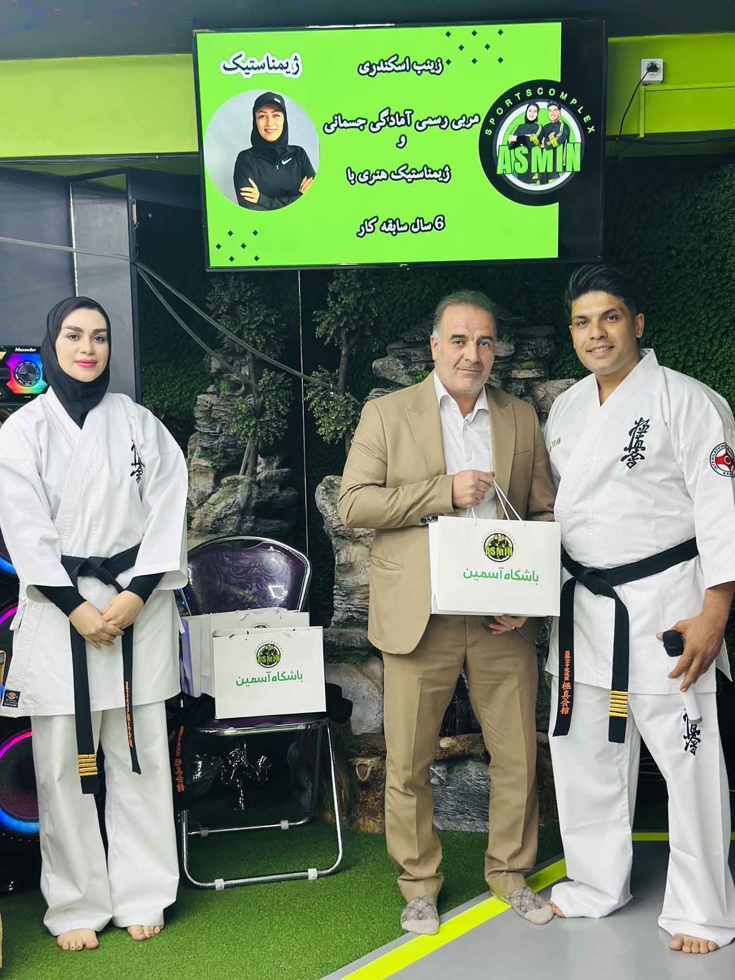 شیهان حسین ابراهیمی از سال ۱۳۷۷رشته ی کاراته رو شروع کردند و بیش از ۱۵دوره قهرمانی در مسابقات کشوری،استانی در آلبوم افتخاراتشان ثبت کردند و در سال ۱۳۹۱ بعنوان جوانترین مربی کشور معرفی شدند که در همان سال توسط پدر کاراته ایران( هانشی حسین لطیفی )مفتخر به دریافت کمربند مشکی دان ۴ گردیدند .ایشون در حال حاضر نماینده جنوب شرق استان تهران در سبک پر افتخار و قدرتمند ماتسوشیما هستند.شیهان حسین ابراهیمی با مدارک معتبر مربیگری درجه یک ملی کاراته جمهوری اسلامی ایران ، B آسیا،مربیگری فیزیکال فیتنس،کارشناس تغذیه با مدرک جهانی تغذیه و داور رسمی فدراسیون جمهوری اسلامی یکی از موفق‌ترین مربیان جوان حال حاضر کشور که توانسته با پشتکار قهرمانان بسیاری را در تمام رده های سنی تربیت کند.شیهان یاسمن مصطفی لو همسر شیهان حسین ابراهیمی قهرمان کشور،قهرمان استان تهران و مربی کاراته با مدرک درجه دو ملی کاراته و فیزیکال فیتنس و تی آرایکس و داور رسمی فدراسیون کاراته و مشاور تغذیه با مدرک جهانی تغذیه و مسئول سبکهای آزاد کاراته پاکدشت و نماینده استان تهران با تربیت شاگردانی زبده توانسته قهرمانی‌های بسیاری در سطح کشور،بین المللی و آسیایی در کارنامه ی خود و هنرجویانش ثبت کند.در حال حاضر زوج قهرمان و قهرمان پرور پاکدشتی در مجموعه ورزشی مجهز آسمین که با تخصص خودشون تأسیس کردند به جامعه ی ورزشی در رشته های ورزشی مختلف با حضور مربیان باتجربه خدمت رسانی می‌کنند.در ادامه ی این مراسم با شکوه، شیهان حسین ابراهیمی از جهان پهلوان علی تکلو بخاطر خدمت رسانی خیر خواهانه در خصوص آزادی زندانیان و کمک رسانی به کودکان و خانواده های بی سرپرست تقدیر و تشکر کرد و هدایایی به رسم یادبود از طرف مدیریت مجموعه ورزشی آسمین(زوج جوان) به مسئولین و میهمانان گرامی تقدیم گردید.